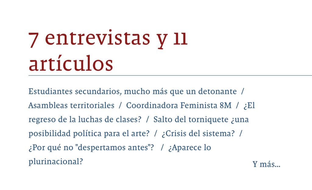 Este nuevo libro es producto de una convocatoria abierta y reúne once artículos y siete entrevistas con dirigentes sociales y activistas sindicales, portuarios, estudiantiles, medioambientales; así como profesionales y académicxs. Los trabajos seleccionados y las entrevistas abordan la pregunta por el origen y significado de la revuelta social, sus actores, discursos y nuevos lenguajes e íconos; disputas y conflictos, junto con  diversas experiencias de organización local, sectorial y territorial.