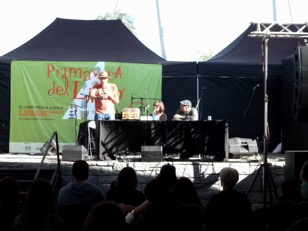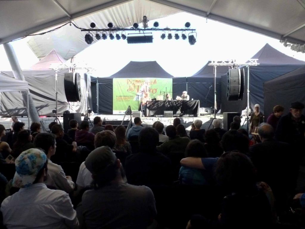 Más de 80 personas llenaron el escenario principal de la Feria para escuchar las intervenciones de Franck Gaudichaud y Luis Martín-Cabrera, quienes se refirieron al contenido de los artículos y a los desafíos actuales a los que se ven enfrentados los movimientos y experiencias relatadas.