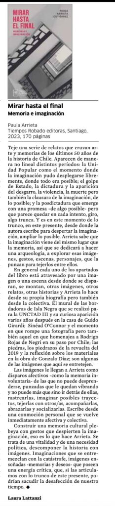 Mirar hasta el final. Memoria e imaginación de Paula Arrieta teje una serie de relatos que cruzan arte y memorias de los últimos 50 años de la historia de Chile. Aparecen de manera no lineal distintos períodos: la Unidad Popular como el momento donde la imaginación pudo desplegarse libremente, donde todo era posible; el golpe de Estado, la dictadura y la aparición del desgarro, la violencia, la muerte pero también la clausura de la imaginación, de lo posible; y la posdictadura que emerge con una promesa -de algo posible- pero que parece quedar en cada intento, giro, algo trunca. Y es en este momento de lo trunco, en este presente, desde donde la autora escribe para despertar la imaginación, ampliar lo posible. Arrieta sabe que la imaginación viene del mismo lugar que la memoria, así que se dedicará a hacer una arqueología, a explorar esas imágenes, gestos, escenas, personajes, que la punzan para tejerlos entre ellos.