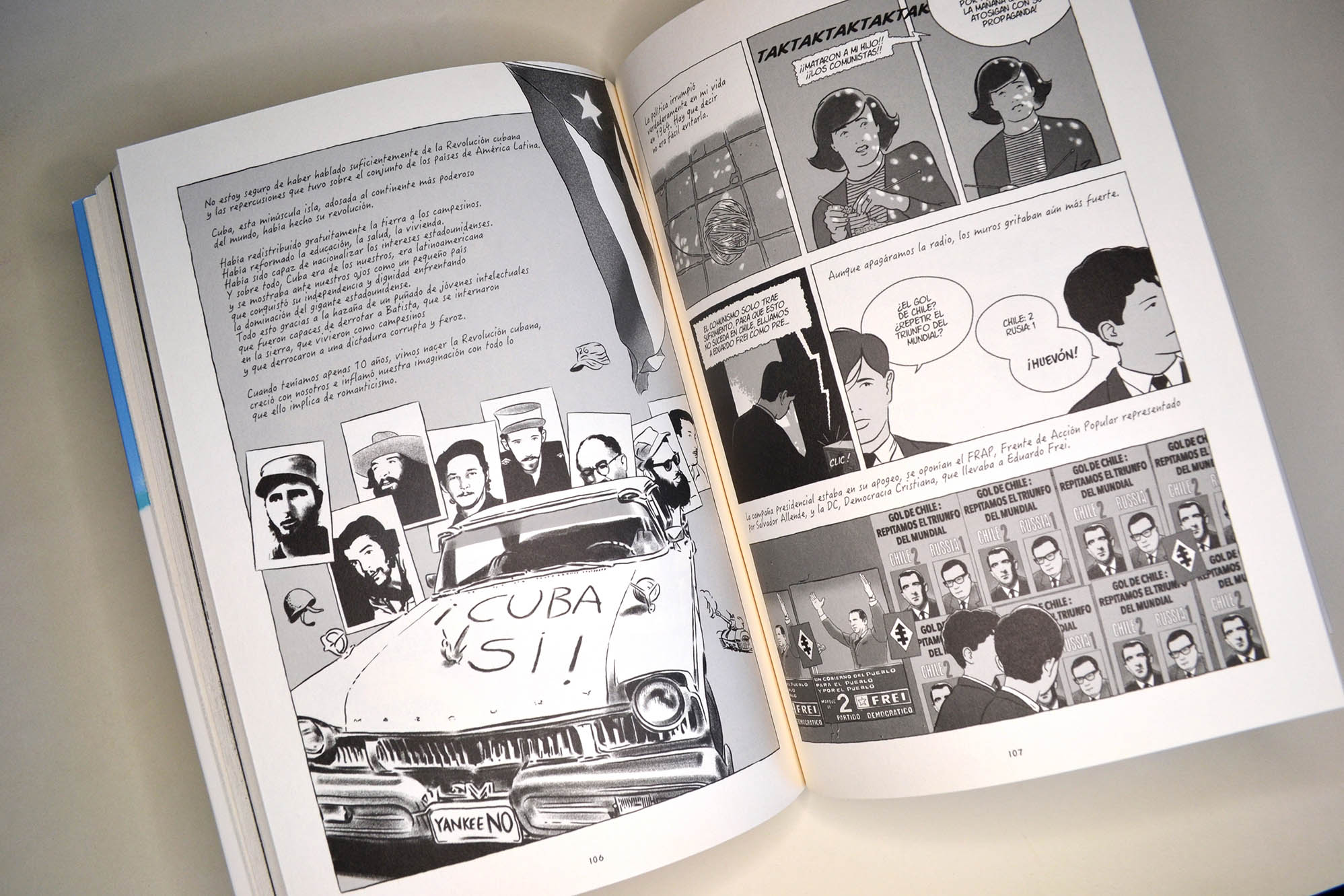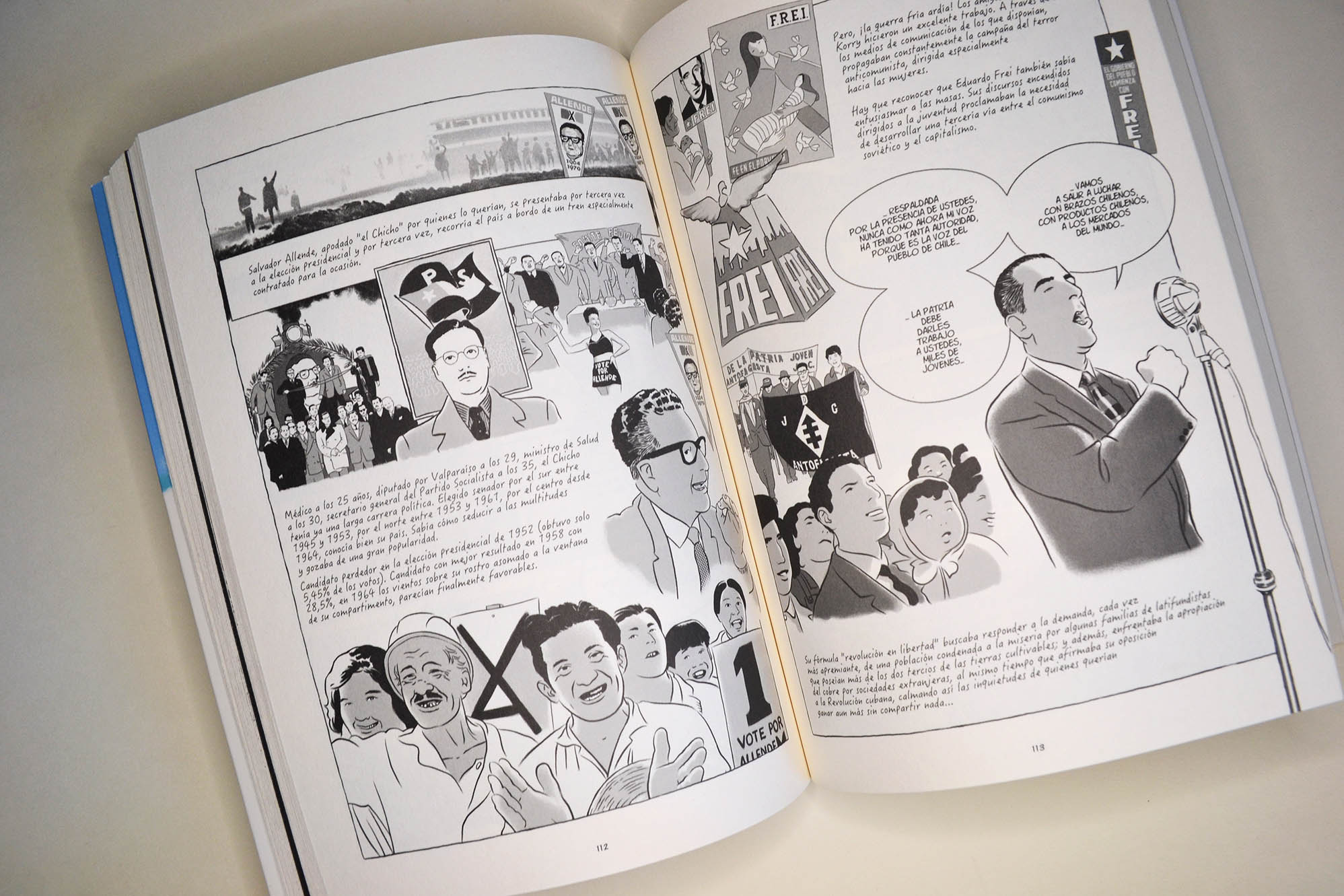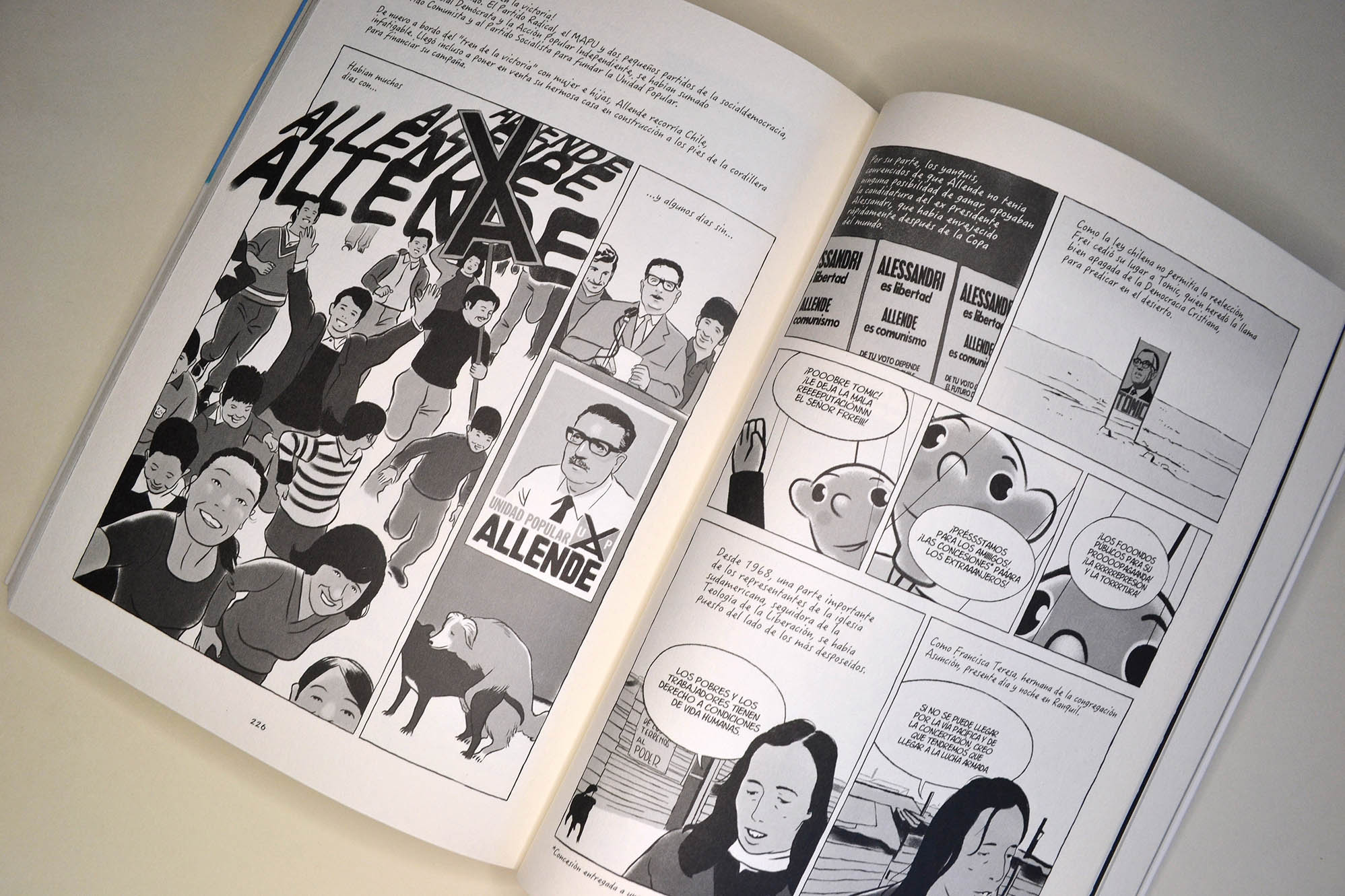 “Esta magnífica novela gráfica propone un recorrido por el Chile de las luchas sociales, de la revuelta creciente, el Chile de toda una generación politizada que condujo a este país, situado “donde se termina la tierra” a la victoria de Salvador Allende en 1970. Esta historia es vista a través de los ojos del joven Pedro, hijo del escritor Guillermo Atías. Exiliado en Francia después del golpe de Estado del general Pinochet, abrió la puerta de su memoria a Alain y Désirée Frappier, y es todo un pueblo movilizado el que aparece: desde las réplicas de la revolución cubana, pasando por la creación del Movimiento de Izquierda Revolucionaria (MIR), hasta la elección del compañero-presidente… Es también un recorrido íntimo, apoyado por ilustraciones en blanco y negro de una fuerza conmovedora, que le otorga tanta relevancia a los magníficos paisajes de Chile, sus volcanes y sus calles, como a las masivas manifestaciones populares en Santiago. “Y de repente, un delirio de alegría invadió las calles de Santiago. […] Los padres habían despertado a los niños, la gente reía, se abrazaba”, los mil días de la “vía chilena al socialismo” habían comenzado”